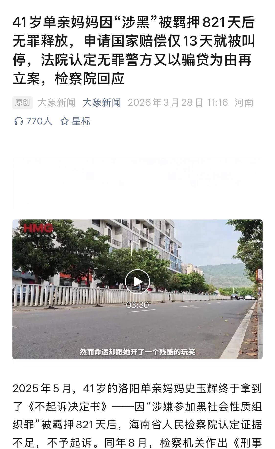 (关联报道:41岁单亲妈妈因“涉黑”被羁押821天后无罪释放,申请国家赔偿仅13天就被叫停,法院认定无罪警方又以骗贷为由再立案,检察院回应)